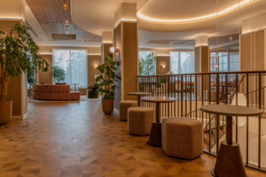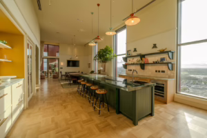 It was the perfect way to celebrate a project that’s been all about creating spaces for people. From the ground-floor lounges to the first-floor gym, wellness space and co-working area, right up to the 33rd-floor residents’ rooftop kitchen and terrace that Richard bravely launched himself from!