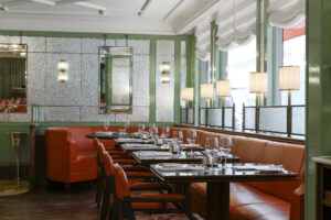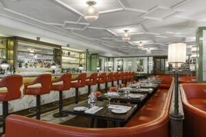 The redesign preserved the venue’s classic charm while introducing contemporary elements. Bespoke solid walnut tabletops were crafted to enhance the dining experience, and the space was adorned with luxurious materials such as brass and custom-designed carpets, reflecting a blend of old-world elegance and modern sophistication.