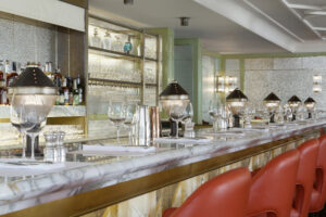 Situated within Fortnum & Mason, 45 Jermyn Street underwent a transformation led by Martin Brudnizki Design Studio. The design harmoniously fuses the store’s heritage with modern luxury, featuring traditional oak parquet flooring, rosewood tables, and Edwardian-inspired details. A striking marble bar serves as a central feature, complemented by intimate booths and a vibrant color palette, establishing a dynamic and sophisticated atmosphere