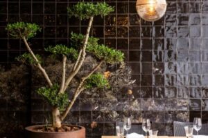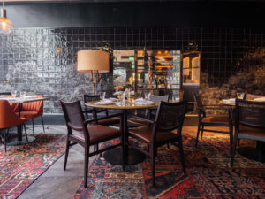 The restaurant’s interiors combine contemporary elegance with authentic Spanish charm, featuring a tasteful mix of glass, ethnic art pieces, and traditional tapestry-style rugs. The color palette reflects the warmth of the wood-fired cooking central to the dining experience, creating a cozy and welcoming atmosphere.
