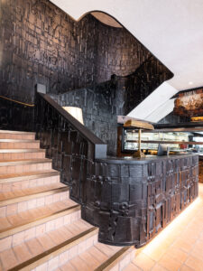 The fit-out process encompassed the transformation of the space to reflect the vision of Spanish interior designer Lázaro Rosa-Violán. The design features open fires, a six-meter wood fire stove, and a glazed wine cellar, providing a spectacular visual backdrop for guests. The main dining room offers immersive, theatrical seating around the open kitchen, while the upper floor provides an exclusive dining experience with private rooms.