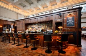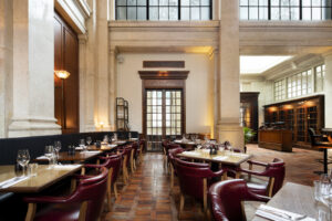 The transformation involved meticulous restoration to honor the building’s historical significance. The design team replicated original features such as mouldings and joinery, ensuring a seamless blend between the new restaurant and the building’s storied past.
