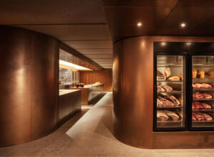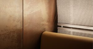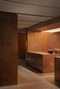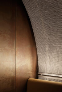 The project demanded a high level of fit & finish. Our scope of works included new concrete stone flooring, antique copper & curved leather paneling and a floating bench.