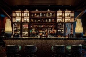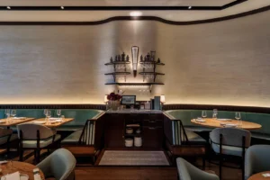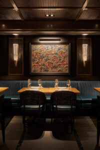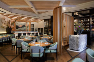 The ground floor, ‘Midori,’ reflects the tranquil side of the mountain, featuring elements reminiscent of Japanese zen gardens, such as green leather banquette seating and oyster shell walls.