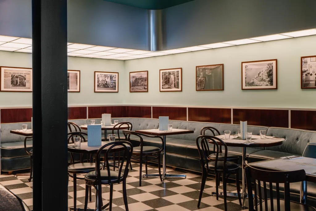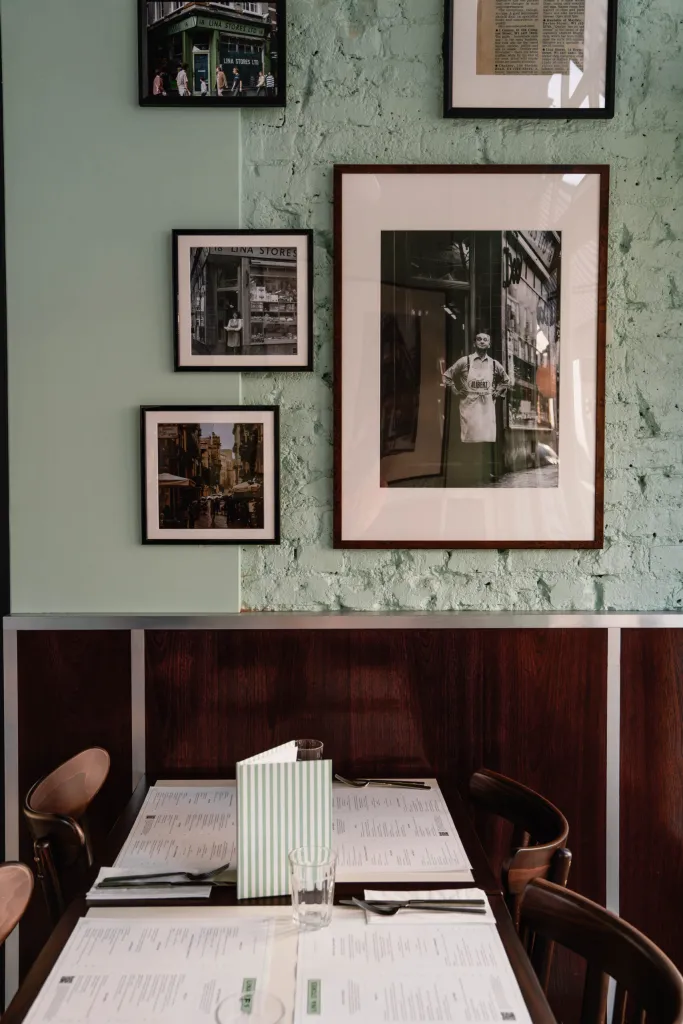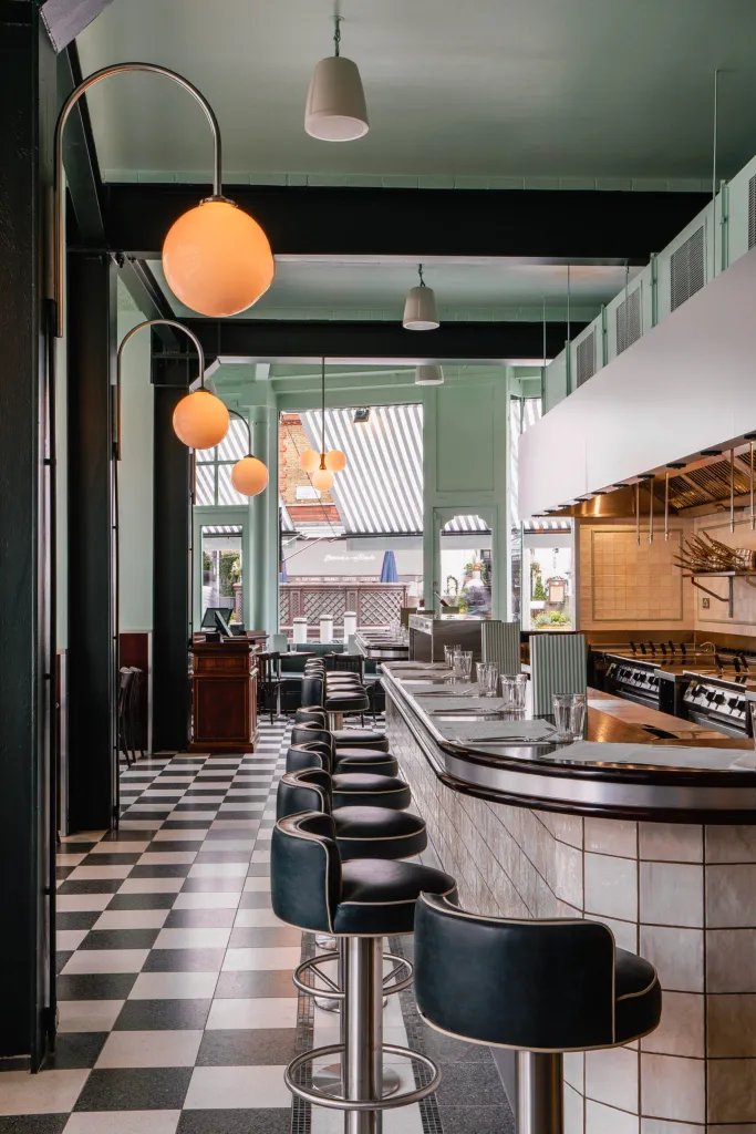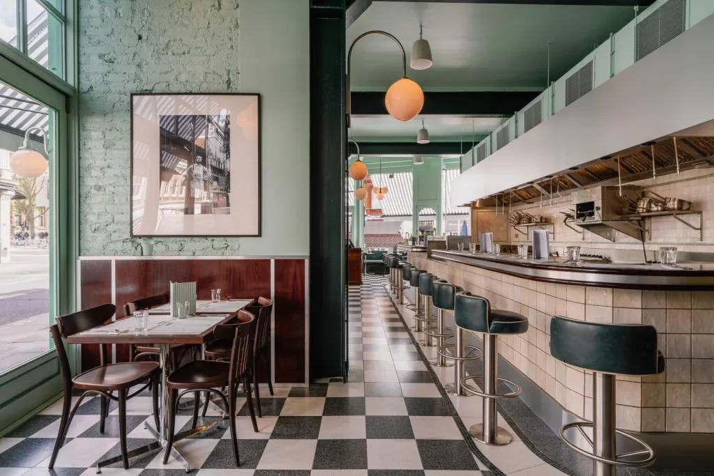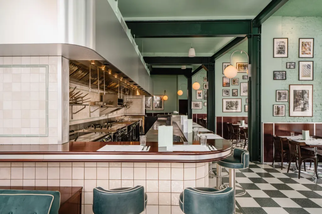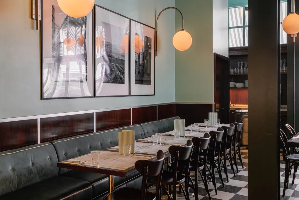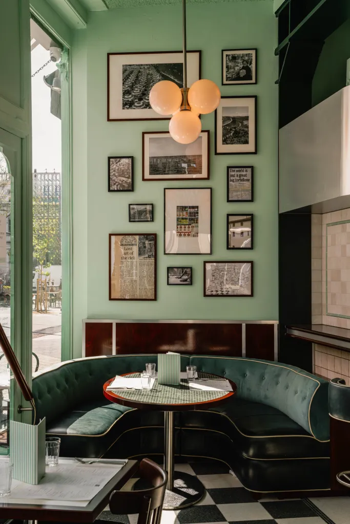 Timber paneling against the Lina Stores Green painted brickwork finishes the walls. Acoustic treatments throughout the restaurant improve customer comfort.