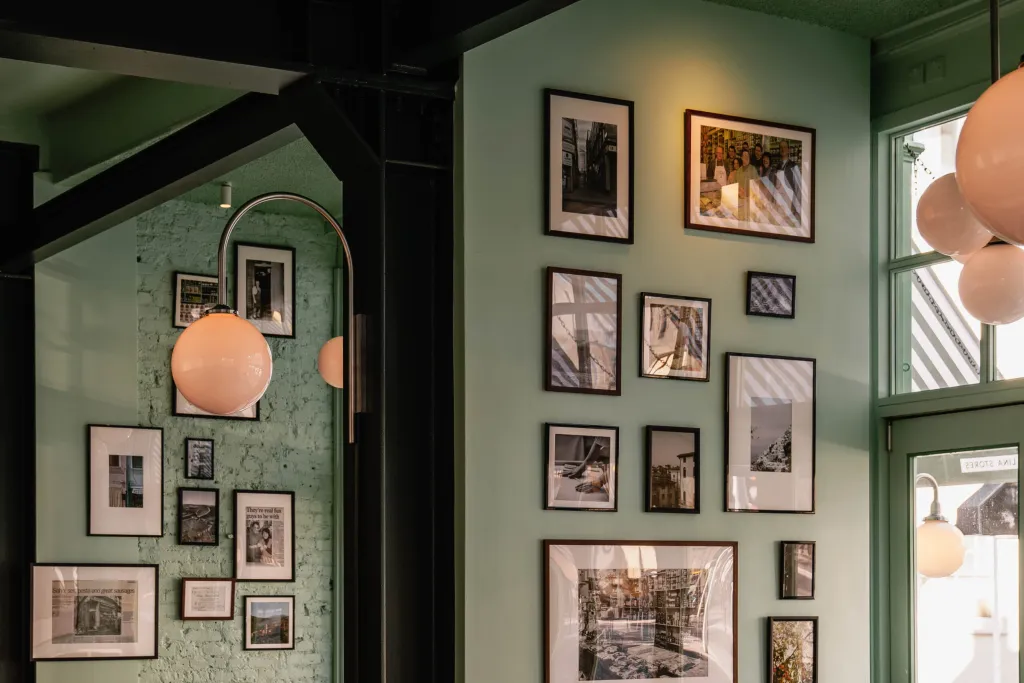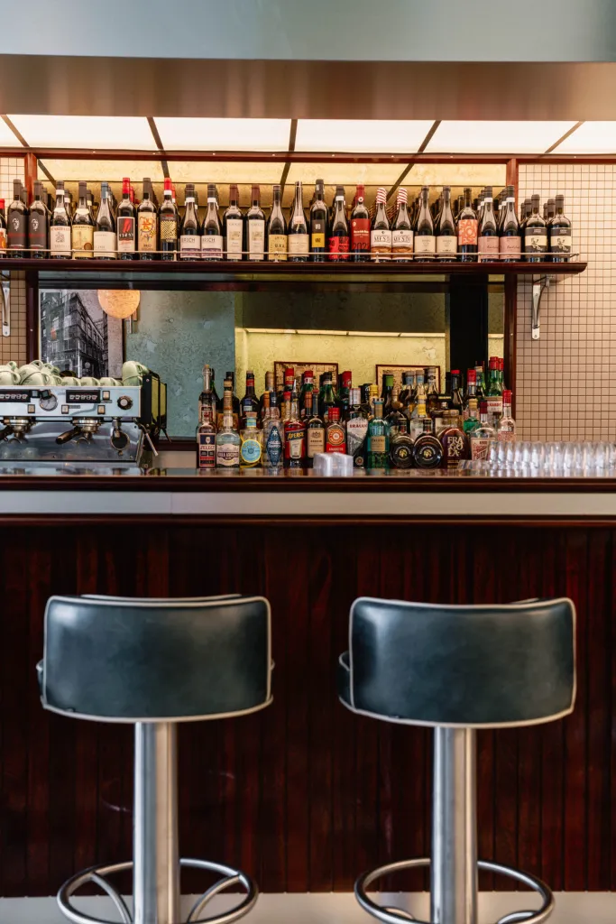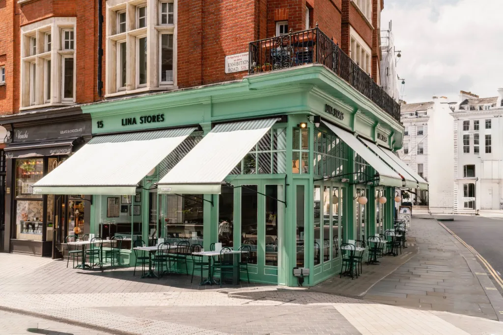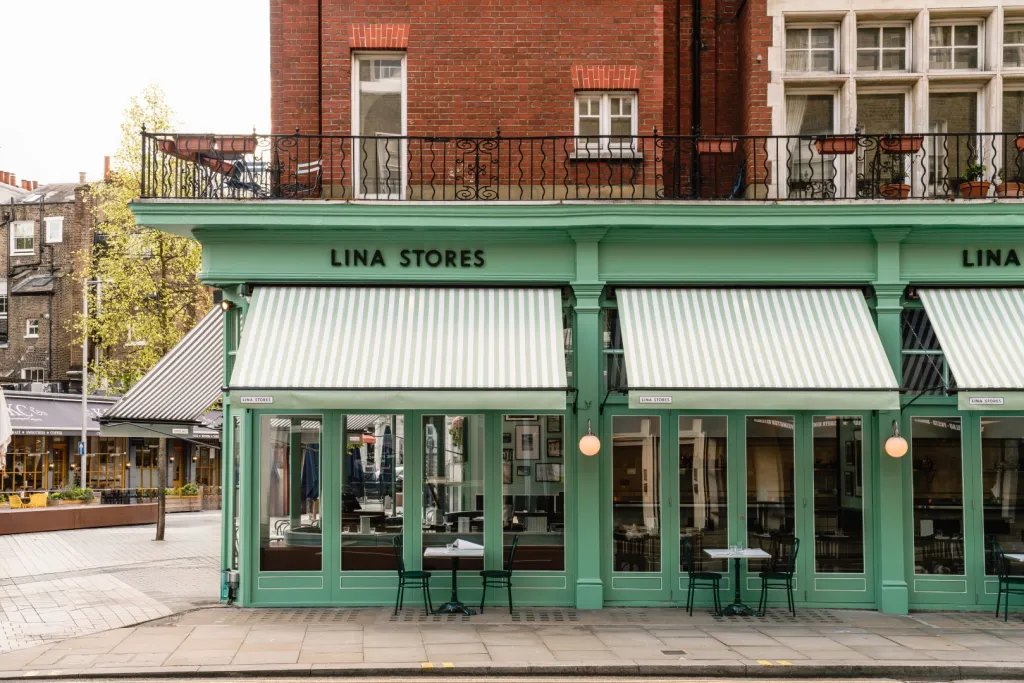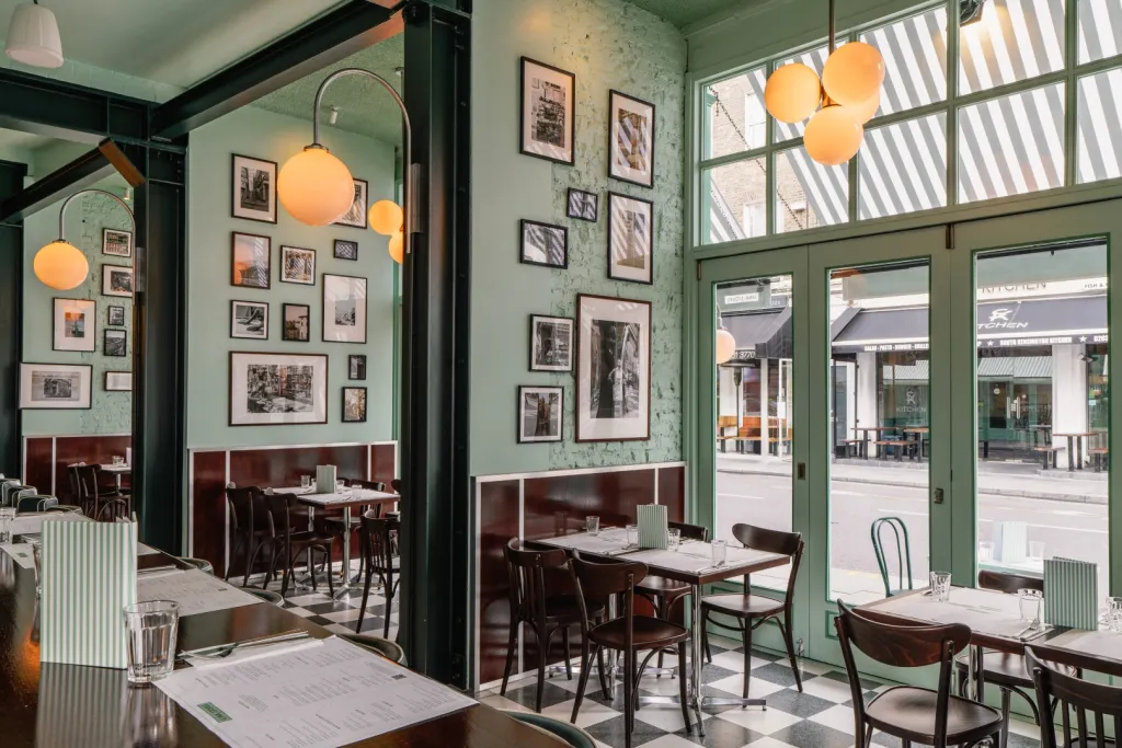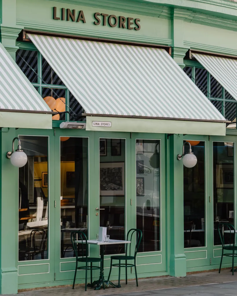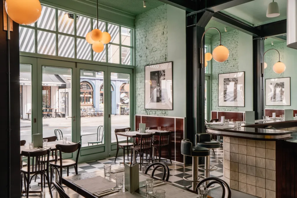 Timber paneling against the Lina Stores Green painted brickwork finishes the walls. Acoustic treatments throughout the restaurant improve customer comfort.