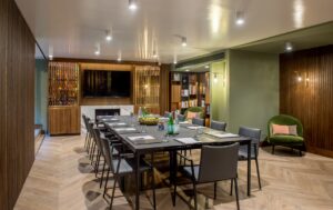The meeting rooms are equipped with modern amenities, including open fireplaces, integrated media screens, and individually controlled lighting and sound systems. The spaces’ design ensures a harmonious blend of aesthetics and functionality, making them suitable for diverse events.