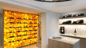 The design, executed by Studio Four IV, features bespoke joinery, luxurious finishes, and specialized storage solutions, creating an inviting atmosphere for wine enthusiasts and investors alike.