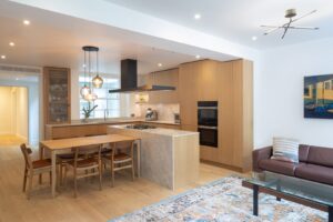 The project involved a comprehensive internal reconfiguration to optimise space and light. Structural challenges were complex given the buildings listed status. We designed and installed a picture frame structure to fully open out the space. The challenge was addressed with a simplified structural design to create open, uncluttered spaces. The design emphasised natural materials and bespoke furnishings to create a cohesive and inviting environment.