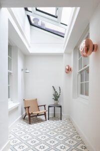 The design focused on enhancing natural light and spatial flow so du Boulay began by removing internal partitions to create two en-suite bathrooms and a guest WC. The kitchen was re-positioned adjacent to the internal courtyard, fostering a central communal space. Natural materials such as pale walls, wide oak flooring, and marble surfaces were used throughout, complemented by custom quarter-sawn oak kitchen joinery with walnut detailing and midcentury furniture pieces